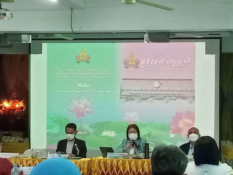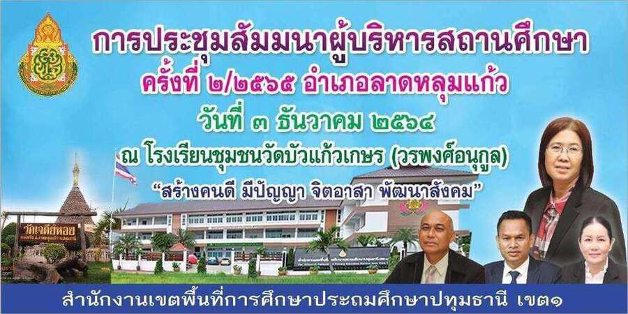 วันศุกร์ที่ 3 เดือนธันวาคม พ.ศ. 2564 ดร.กนิษฐา ทองเลิศ ผู้อำนวยการสำนักงานเขตพื้นที่การศึกษาประถมศึกษาปทุมธานี เขต 1 เป็นประธานการประชุมสัมมนาผู้บริหารสถานศึกษา ครั้งที่ 2/2565 รอบที่ 1 อำเภอลาดหลุมแก้ว โดยมีผู้บริหารทั้ง 2 กลุ่มเครือข่ายส่งเสริมประสิทธิภาพการจัดการศึกษา เข้าร่วมประชุมฯ ในครั้งนี้ ณ ห้องประชุมโรงเรียนชุมชนวัดบัวแก้วเกษร (วรพงศ์อนุกูล) อำเภอลาดหลุมแก้ว จังหวัดปทุมธานี S:0