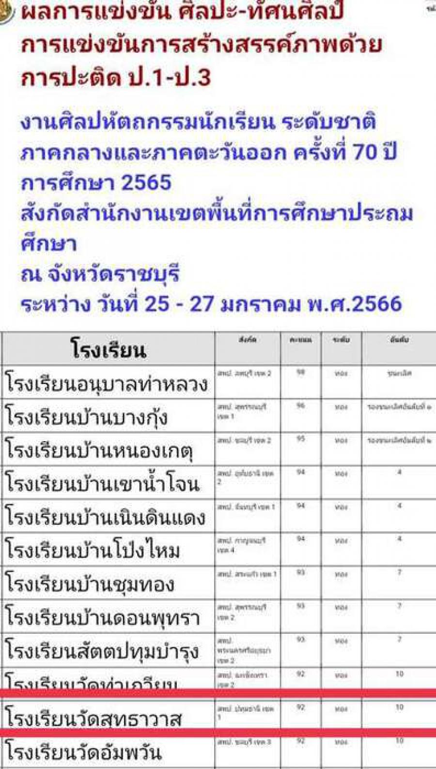 ผลการแข่งขันงานศิลปหัตกรรมนักเรียน ครั้งที่ 70 ของโรงเรียนวัดสุทธาวาส ระดับชาติ ภาคกลาง และภาคตะวันออก ณ จังหวัดราชบุรี ปีการศึกษา 2565 ???? เหรียญทอง อันดับที่ 10 การแข่งขันศิลปะ-ทัศนศิลป์ การแข่งขันการสร้างสรรค์ภาพด้วยการประติด ป.1-ป.3 ???? ขอแสดงความยินดีกับนักเรียนและคุณครูที่ฝึกซ้อม ???? S:0