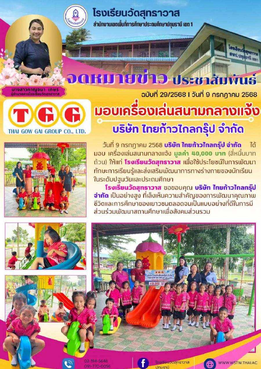 วันที่ 9 กรกฎาคม 2568 บริษัท ไทยก้าวไกลกรุ๊ป จำกัดได้มอบ เครื่องเล่นสนามกลางแจ้ง มูลค่า 40,000 บาท (สี่หมื่นบาทถ้วน) ให้แก่ โรงเรียนวัดสุทธาวาส เพื่อใช้ประโยชน์ในการพัฒนาทักษะการเรียนรู้และส่งเสริมพัฒนาการทางร่างกายของนักเรียนในระดับปฐมวัยและประถมศึกษา โรงเรียนวัดสุทธาวาส ขอขอบคุณ บริษัท ไทยก้าวไกลกรุ๊ป จำกัด เป็นอย่างสูง ที่เล็งเห็นความสำคัญของการพัฒนาคุณภาพชีวิตและการศึกษาของเยาวชนตลอดจนเป็นแบบอย่างที่ดีในการมีส่วนร่วมพัฒนาสถานศึกษาเพื่อสังคมส่วนรวม S:0