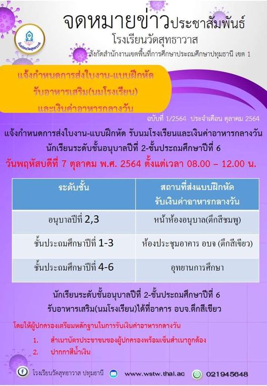 กำหนดการส่งใบงาน-แบบฝึกหัด รับอาหารเสริม (นมโรงเรียน) และเงินค่าอาหารกลางวัน