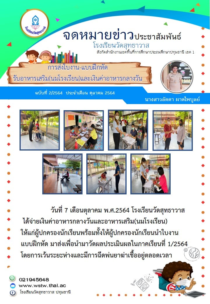 วันที่ 7 ตุลาคม พ.ศ.2564 โรงเรียนวัดสุทธาวาส ได้จ่ายเงินค่าอาหารกลางวันและอาหารเสริม (นมโรงเรียน)ให้แก่ผู้ปกครองนักเรียนพร้อมทั้งให้ผู้ปกครองนักเรียนนำใบงาน แบบฝึกหัด มาส่งเพื่อวัดผลประเมินผลในภาคเรียนที่ 1/2564 โดยมีการเว้นระยะห่างและมีการฉีดพ่นยาฆ่าเชื้อตลอดเวลา