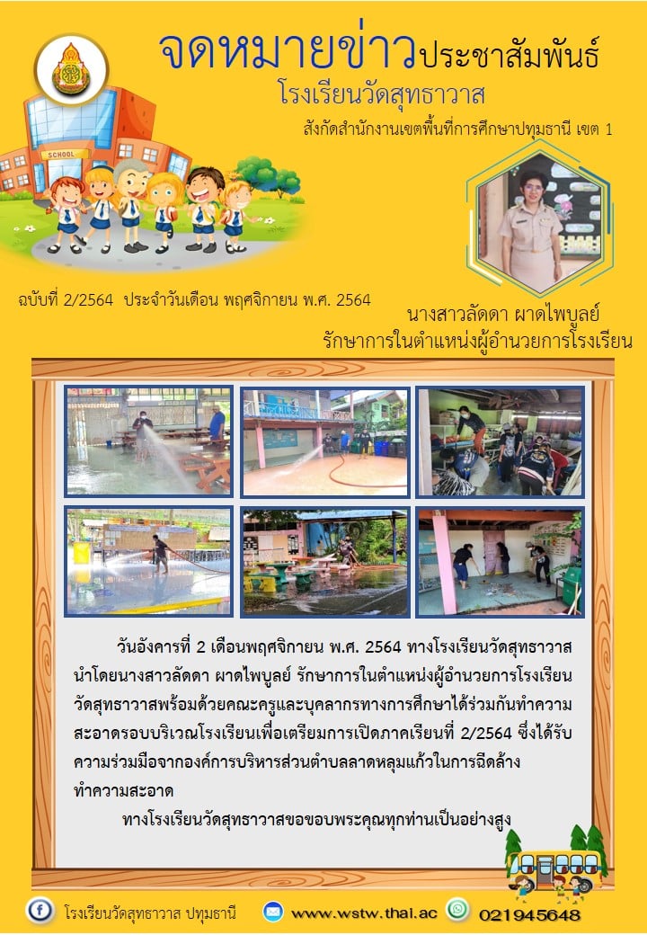 วันอังคารที่ 2 พฤศจิกายน 2564 โรงเรียนวัดสุทธาวาส นำโดยนางสาวลัดดา ผาดไพบูลย์ รักษาการในตำแหน่งผู้อำนวยการโรงเรียนวัดสุทธาวาสพร้อมด้วยคณะครูและบุคลากรทางการศึกษาได้ร่วมกันทำความสะอาดรอบบริเวณโรงเรียนเพื่อเตรียมการเปิดภาคเรียนที่ 2/2564ซึ่งได้รับความร่วมมือจากองค์การบริหารส่วนตำบลลาดหลุมแก้วในการฉีดล้างทำความสะอาดโรงเรียนวัดสุทธาวาสขอขอบพระคุณทุกท่านเป็นอย่างสูง