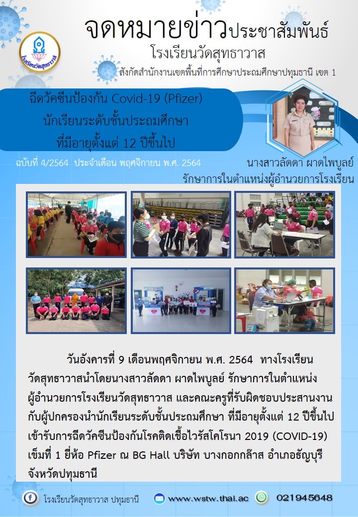 วันอังคารที่ 9 พฤศจิกายน พ.ศ. 2564 ทางโรงเรียนวัดสุทธาวาส นำโดยนางสาวลัดดา ผาดไพบูลย์ รักษาการในตำแหน่งผู้อำนวยการโรงเรียนวัดสุทธาวาสและคณะครูที่รับผิดชอบประสานงานกับผู้ปกครองนำนักเรียนระดับชั้นประถมศึกษา ที่มีอายุตั้งแต่ 12 ปีขึ้นไป เข้ารับการฉีดวัคซีนป้องกันโรคติดเชื้อไวรัสโคโรนา 2019 (COVID-19) เข็มที่ 1 ยี่ห้อ Pfizer ณ BG Hall บริษัทบางกอกกล๊าส อำเภอธัญบุรี จังหวัดปทุมธานี