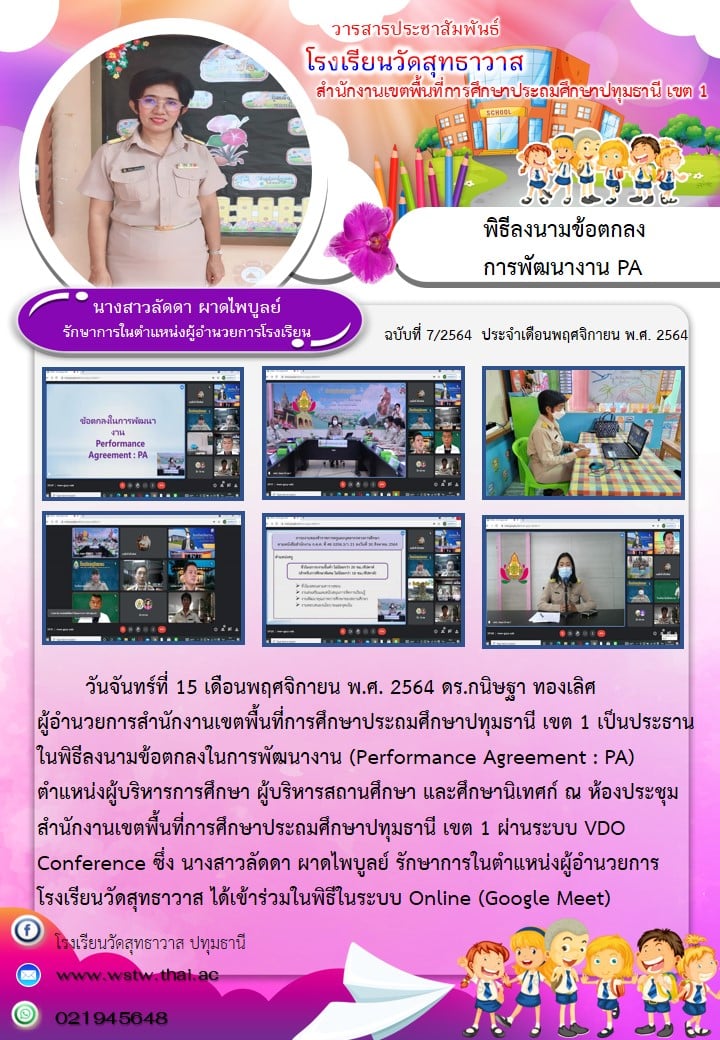 วันจันทร์ที่ 15 เดือนพฤศจิกายน พ.ศ. 2564 ดร.กนิษฐา ทองเลิศ ผู้อำนวยการสำนักงานเขตพื้นที่การศึกษาประถมศึกษาปทุมธานี เขต 1เป็น ประธานในพิธีลงนามข้อตกลงในการพัฒนางาน (Performance Agreement : PA) ตำแหน่งผู้บริหารการศึกษา ผู้บริหารสถานศึกษาและศึกษานิเทศก์ ณ ห้องประชุมสำนักงานเขตพื้นที่การศึกษาประถมศึกษาปทุมธานี เขต 1 ผ่านระบบ VDO Conference ซึ่ง นางสาวลัดดา ผาดไพบูลย์ รักษาการในตำแหน่งผู้อำนวยการโรงเรียนวัดสุทธาวาส ได้เข้าร่วมในพิธีในระบบ Online (Google Meet