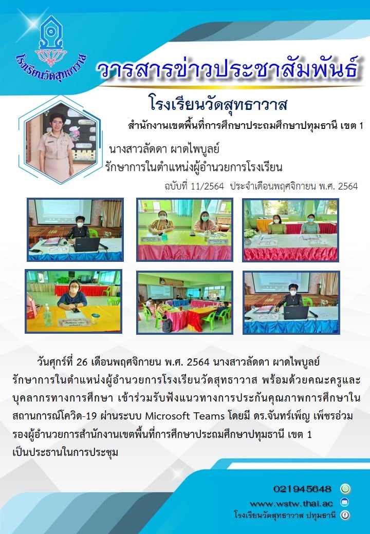 วันศุกร์ที่ 26 เดือนพฤศจิกายน พ.ศ. 2564 นางสาวลัดดา ผาดไพบูลย์ รักษาการในตำแหน่งผู้อำนวยการโรงเรียนวัดสุทธาวาส พร้อมด้วยคณะครูและบุคลากรทางการศึกษา เข้าร่วมรับฟังแนวทางการประกันคุณภาพการศึกษาในสถานการณ์โควิด-19 ผ่านระบบ Microsoft Teams โดยมี ดร.จันทร์เพ็ญ เพ็ชรอ่วม รองผู้อำนวยการสำนักงานเขตพื้นที่การศึกษาประถมศึกษาปทุมธานี เขต 1 เป็นประธานในการประชุม