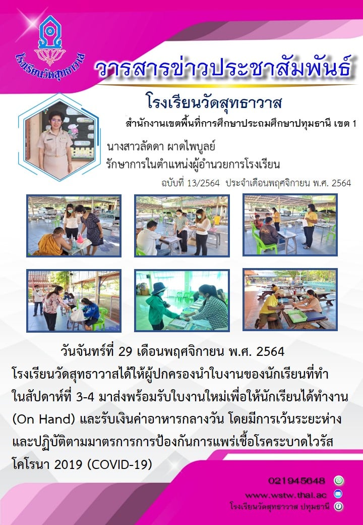 วันจันทร์ที่ 29 เดือนพฤศจิกายน พ.ศ. 2564 โรงเรียนวัดสุทธาวาสได้ให้ผู้ปกครองนำใบงานของนักเรียนที่ทำในสัปดาห์ที่ 3-4 มาส่งพร้อมรับใบงานใหม่เพื่อให้นักเรียนได้ทำงาน(On Hand) และรับเงินค่าอาหารกลางวัน โดยมีการเว้นระยะห่างและปฏิบัติตามมาตรการการป้องกันการแพร่เชื้อโรคระบาดไวรัสโคโรนา 2019 (COVID-19)