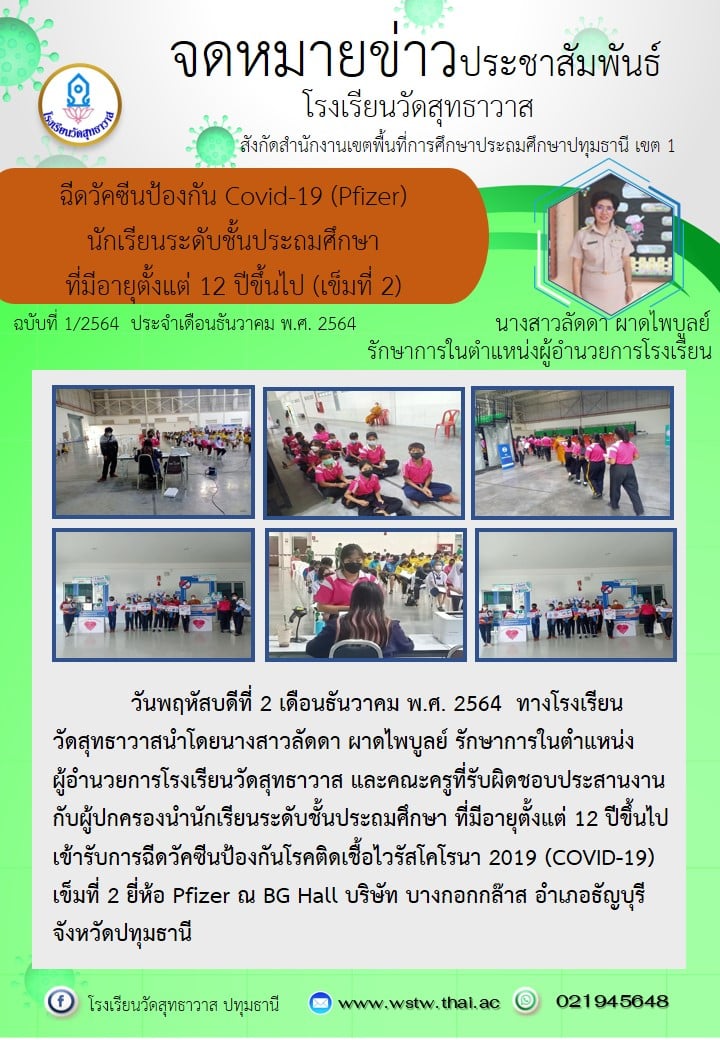 วันพฤหัสบดีที่ 2 เดือนธันวาคม พ.ศ. 2564 ทางโรงเรียนวัดสุทธาวาสนำโดยนางสาวลัดดา ผาดไพบูลย์ รักษาการในตำแหน่งผู้อำนวยการโรงเรียนวัดสุทธาวาส และคณะครูที่รับผิดชอบประสานงานกับผู้ปกครองนำนักเรียนระดับชั้นประถมศึกษา ที่มีอายุตั้งแต่ 12 ปีขึ้นไป เข้ารับการฉีดวัคซีนป้องกันโรคติดเชื้อไวรัสโคโรนา 2019 (COVID-19) เข็มที่ 2 ยี่ห้อ Pfizer ณ BG Hall บริษัท บางกอกกล๊าส อำเภอธัญบุรี จังหวัดปทุมธานี