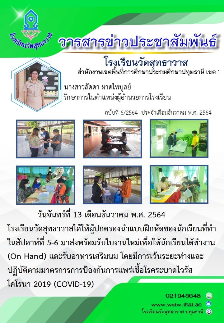 วันจันทร์ที่ 13 เดือนธันวาคม พ.ศ. 2564 โรงเรียนวัดสุทธาวาสได้ให้ผู้ปกครองนำแบบฝึกหัดของนักเรียนที่ทำในสัปดาห์ที่ 5-6 มาส่งพร้อมรับใบงานใหม่เพื่อให้นักเรียนได้ทำงาน(On Hand) และรับอาหารเสริมนม โดยมีการเว้นระยะห่างและปฏิบัติตามมาตรการการป้องกันการแพร่เชื้อโรคระบาดไวรัสโคโรนา 2019 (COVID-19)