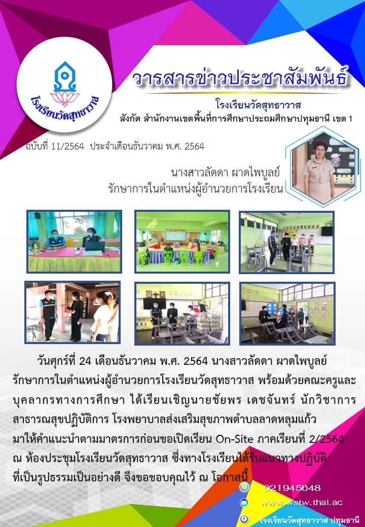 วันศุกร์ที่ 24 เดือนธันวาคม พ.ศ. 2564 นางสาวลัดดา ผาดไพบูลย์ รักษาการในตำแหน่งผู้อำนวยการโรงเรียนวัดสุทธาวาส พร้อมด้วยคณะครูและบุคลากรทางการศึกษา ได้เรียนเชิญนายชัยพร เดชจันทร์ นักวิชาการสาธารณสุขปฏิบัติการโรงพยาบาลส่งเสริมสุขภาพตำบลลาดหลุมแก้ว มาให้คำแนะนำตามมาตรการก่อนขอเปิดเรียน On-Site ภาคเรียนที่ 2/2564 ณ ห้องประชุมโรงเรียนวัดสุทธาวาส ซึ่งทางโรงเรียนได้รับแนวทางปฏิบัติที่เป็นรูปธรรมเป็นอย่างดี จึงขอขอบคุณไว้ ณ โอกาสนี้