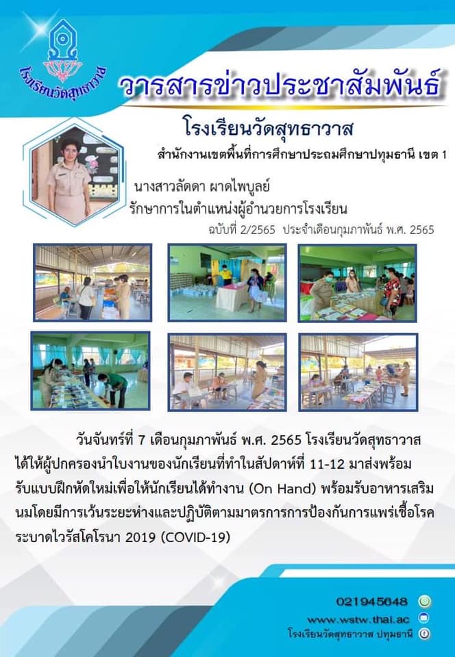 วันจันทร์ที่ 7เดือนกุมภาพันธ์พ.ศ. 2565 โรงเรียนวัดสุทธาวาสได้ให้ผู้ปกครองนำแบบฝึกหัดของนักเรียนที่ทำในสัปดาห์ที่ 11-12 มาส่งพร้อมรับใบงานใหม่เพื่อให้นักเรียนได้ทำงาน (On Hand) พร้อมรับอาหารเสริมนมโดยมีการเว้นระยะห่างและปฏิบัติตามมาตรการการป้องกันการแพร่เชื้อโรคระบาดไวรัสโคโรนา 2019 (COVID-19)