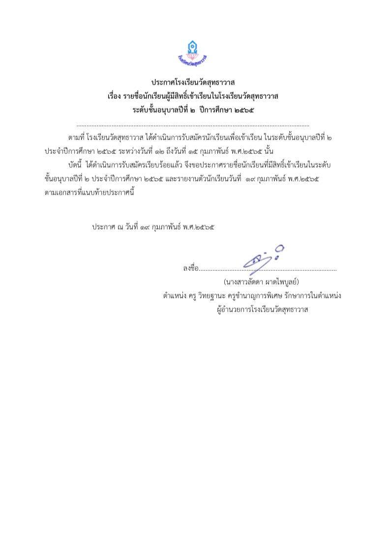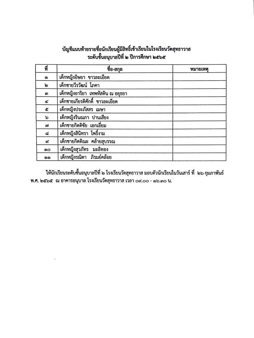 ประกาศรายชื่อนักเรียนผู้มีสิทธิ์เข้าเรียนในโรงเรียนวัดสุทธาวาสระดับชั้นอนุบาล 2