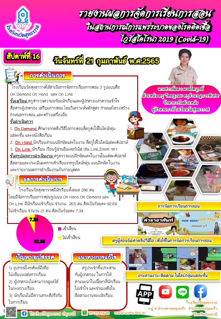 รายงานผลการจัดการเรียนการสอนในสถานการณ์ การแพร่ระบาดของโรคติดเชื้อไวรัสโคโรนา 2019 (COVID-19)ภาคเรียนที่ 2 สัปดาห์ที่ 1ุ6