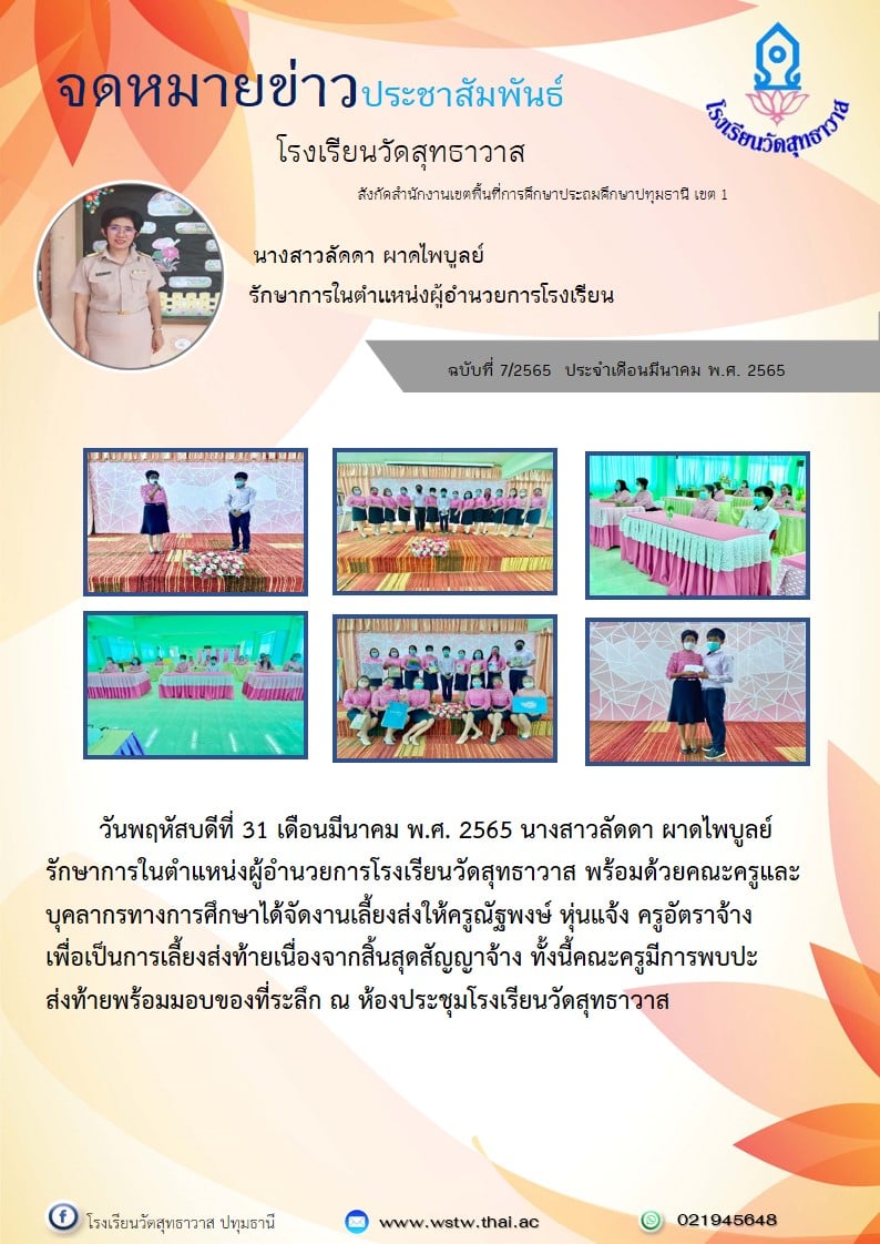 เพื่อเป็นการเลี้ยงส่งท้าย เนื่องจากสิ้นสุดสัญญาจ้าง ทั้งนี้คณะครูมีการพบปะส่งท้ายพร้อมมอบของที่ระลึก ณ ห้องประชุมโรงเรียนวัดสุทธาวาส