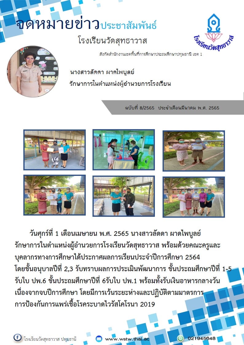 วันศุกร์ที่ 1 เมษายน พ.ศ. 2565 นางสาวลัดดา ผาดไพบูลย์ รักษาการในตำแหน่งผู้อำนวยการโรงเรียนวัดสุทธาวาส พร้อมด้วยคณะครูและบุคลากรทางการศึกษาได้ประกาศผลการเรียนประจำปีการศึกษา 2564 โดยชั้นอนุบาลปีที่ 2, 3 รับทราบผลการประเมินพัฒนาการ ชั้นประถมศึกษาปีที่ 1 - 5 รับใบ ปพ.6 ชั้นประถมศึกษาปีที่ 6 รับใบ ปพ.1 พร้อมทั้งรับเงินอาหารกลางวัน เนื่องจากจบปีการศึกษา โดยมีการเว้นระยะห่างและปฏิบัติตามมาตรการการป้องกันการแพร่เชื้อโรคระบาดไวรัสโคโรนา 2019 (COVID - 19)