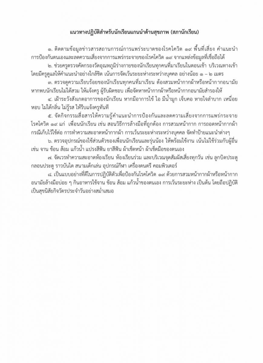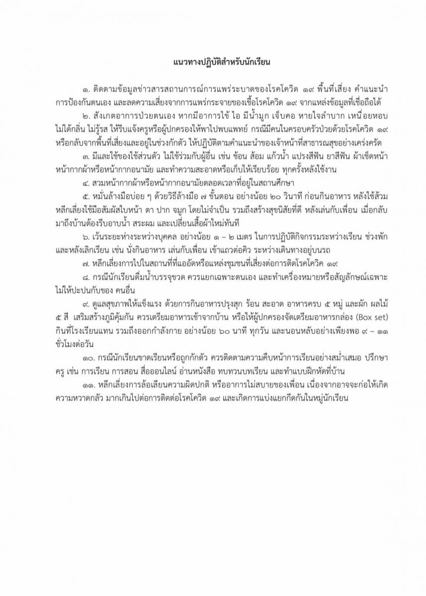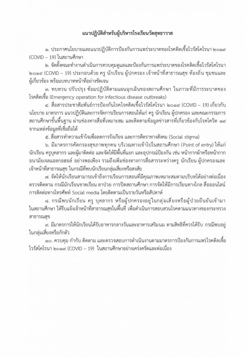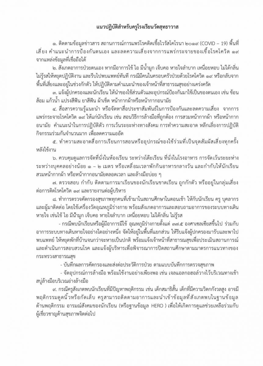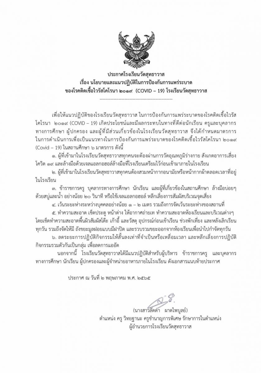 นโยบายและแนวปฎิบัติในการป้องกันการแพร่ระบาดของโรคติดเชื้อไวรัสโคโรนา 2019 (COVID-19)ของ โรงเรียนวัดสุทธาวาส