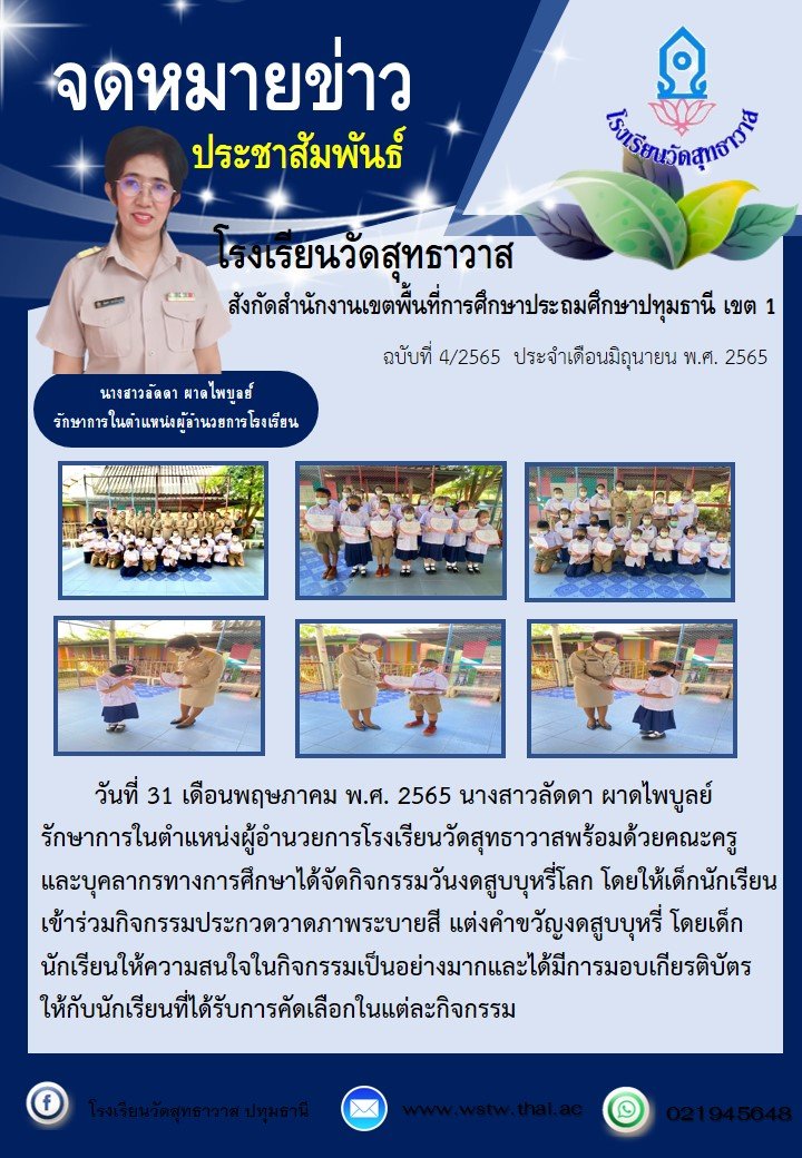 ผู้อำนวยการโรงเรียนวัดสุทธาวาส พร้อมด้วยคณะครูและบุคลากรทางการศึกษาได้จัดกิจกรรมวันงดสูบบุหรี่โลก โดยให้เด็กนักเรียนเข้าร่วมกิจกรรมประกวดวาดภาพระบายสี แต่งคำขวัญงดสูบบุหรี่ โดยเด็กนักเรียนให้ความสนใจในกิจกรรมเป็นอย่างมาก และได้มีการมอบเกียรติบัตรให้กับนักเรียนที่ได้รับการคัดเลือกในแต่ละกิจกรรม