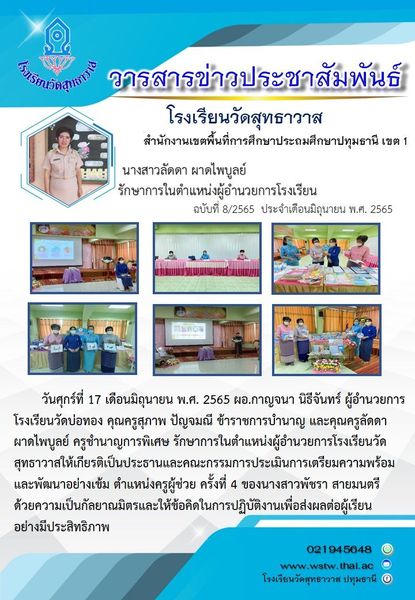 รักษาการในตำแหน่งผู้อำนวยการโรงเรียนวัดสุทธาวาส ให้เกียรติเป็นประธานและคณะกรรมการการประเมินการเตรียมความพร้อมและพัฒนาอย่างเข้มตำแหน่งครูผู้ช่วย ครั้งที่ 4 ของนางสาวพัชรา สายมนตรี ด้วยความเป็นกัลยาณมิตรและให้ข้อคิดในการปฏิบัติงาน เพื่อส่งผลต่อผู้เรียนอย่างมีประสิทธิภาพ