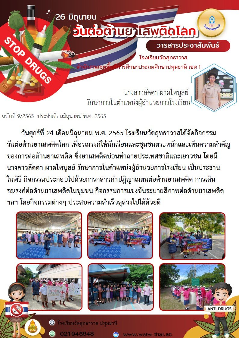 วันศุกร์ที่ 24 เดือนมิถุนายน พ.ศ. 2565 โรงเรียนวัดสุทธาวาสได้จัดกิจกรรมวันต่อต้านยาเสพติดโลก เพื่อรณรงค์ให้นักเรียนและชุมชนตระหนักและเห็นความสำคัญของการต่อต้านยาเสพติด ซึ่งยาเสพติดบ่อนทำลายประเทศชาติ และเยาวชน โดยมี นางสาวลัดดา ผาดไพบูลย์ รักษาการในตำแหน่งผู้อำนวยการโรงเรียน เป็นประธานในพิธี กิจกรรมประกอบไปด้วยการกล่าวคำปฎิญาณตนต่อต้านยาเสพติด การเดินรณรงค์ต่อต้านยาเสพติดในชุมชน กิจกรรมการแข่งขันระบายสีภาพต่อต้านยาเสพติด ฯลฯ โดยกิจกรรมต่างๆ ประสบความสำเร็จลุล่วงไปได้ด้วยดี