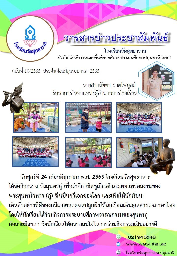 วันศุกร์ที่ 24 เดือนมิถุนายน พ.ศ. 2565 โรงเรียนวัดสุทธาวาสได้จัดกิจกรรม วันสุนทรภู่
