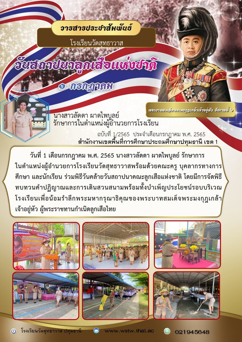 วันที่ 1 กรกฎาคม พ.ศ. 2565 นางสาวลัดดา ผาดไพบูลย์ รักษาการในตำแหน่งผู้อำนวยการโรงเรียนวัดสุทธาวาส พร้อมด้วยคณะครู บุคลากรทางการศึกษา และนักเรียน ร่วมพิธีวันคล้ายวันสถาปนาคณะลูกเสือแห่งชาติ โดยมีการจัดพิธีทบทวนคำปฏิญาณและการเดินสวนสนาม เพื่อน้อมรำลึกพระมหากรุณาธิคุณของพระบาทสมเด็จพระมงกุฎเกล้าเจ้าอยู่หัว ผู้พระราชทานกำเนิดลูกเสือไทย