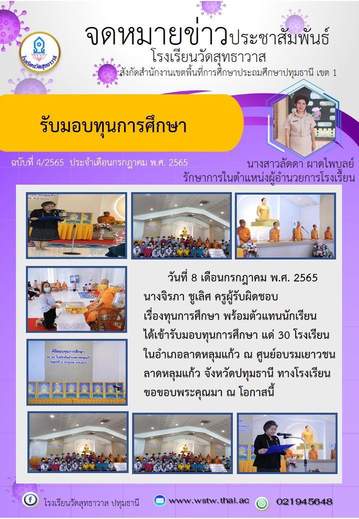 วันที่ 8 กรกฎาคม พ.ศ. 2565 นางจิรภา ชูเลิศ ครูผู้รับผิดชอบ เรื่องทุนการศึกษา พร้อมตัวแทนนักเรียนได้เข้ารับมอบทุนการศึกษา แด่ 30 โรงเรียน ในอำเภอลาดหลุมแก้ว ณ ศูนย์อบรมเยาวชน ลาดหลุมแก้ว จังหวัดปทุมธานี ทางโรงเรียนขอขอบพระคุณมา ณ โอกาสนี้