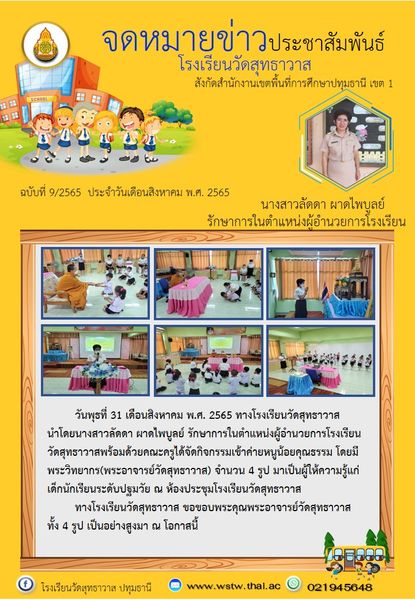 วันพุธที่ 31 สิงหาคม พ.ศ. 2565 ทางโรงเรียนวัดสุทธาวาสนำโดยนางสาวลัดดา ผาดไพบูลย์ รักษาการในตำแหน่งผู้อำนวยการโรงเรียนวัดสุทธาวาส พร้อมด้วยคณะครูได้จัดกิจกรรมเข้าค่ายหนูน้อยคุณธรรม โดยมีพระวิทยากร(พระอาจารย์วัดสุทธาวาส) จำนวน 4 รูป