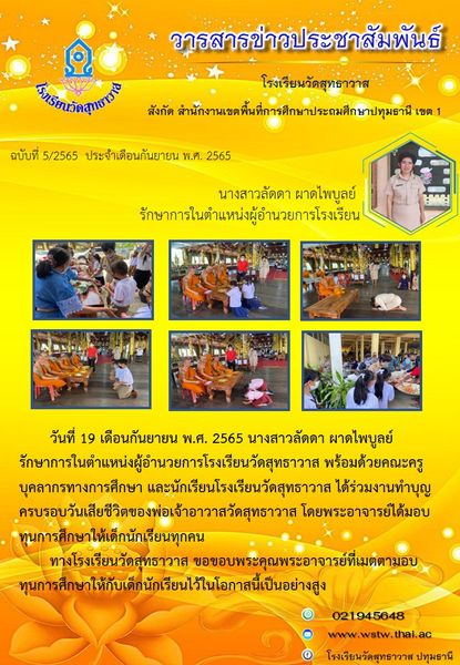 วันที่ 19 เดือนกันยายน พ.ศ. 2565 นางสาวลัดดา ผาดไพบูลย์ รักษาการในตำแหน่งผู้อำนวยการโรงเรียนวัดสุทธาวาส พร้อมด้วยคณะครูบุคลากร