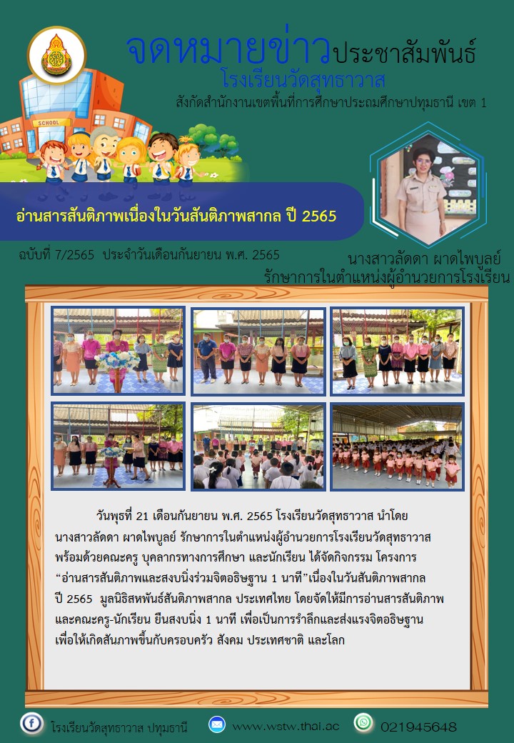 พร้อมด้วยคณะครู บุคลากรทางการศึกษา และนักเรียน ได้จัดกิจกรรม โครงการ“อ่านสารสันติภาพและสงบนิ่งร่วมจิตอธิษฐาน 1 นาที”เนื่องในวันสันติภาพสากล ปี 2565 มูลนิธิสหพันธ์สันติภาพสากลประเทศไทย โดยจัดให้มีการอ่านสารสันติภาพ และคณะครู-นักเรียน ยืนสงบนิ่ง 1 นาที เพื่อเป็นการรำลึกและส่งแรงจิตอธิษฐาน เพื่อให้เกิดสันภาพขึ้นกับครอบครัว สังคม ประเทศชาติ และโลก
