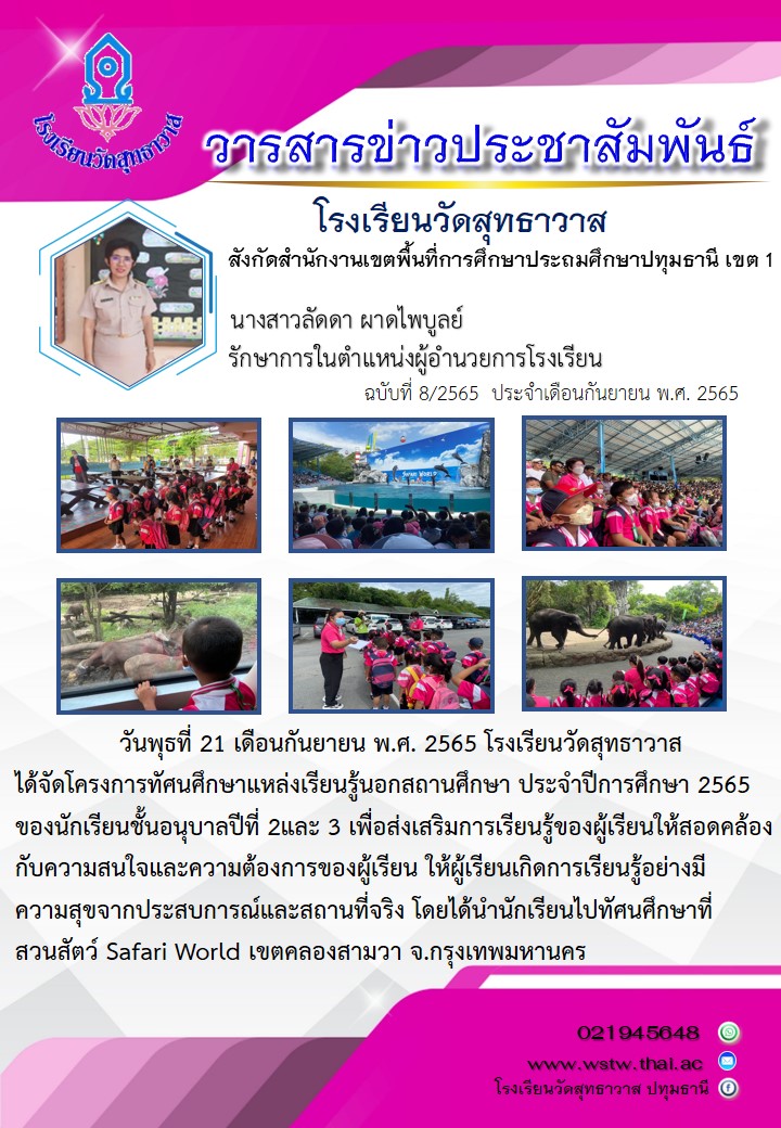 วันพุธที่ 21 กันยายน พ.ศ. 2565 โรงเรียนวัดสุทธาวาส ได้จัดโครงการทัศนศึกษาแหล่งเรียนรู้นอกสถานศึกษา ประจำปีการศึกษา 2565 ของนักเรียนชั้นอนุบาลปีที่ 2และ 3 เพื่อส่งเสริมการเรียนรู้ของผู้เรียนให้สอดคล้องกับความสนใจ