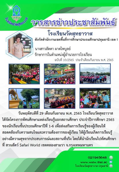 วันพฤหัสบดีที่ 29 กันยายน พ.ศ. 2565 โรงเรียนวัดสุทธาวาสได้จัดโครงการทัศนศึกษาแหล่งเรียนรู้นอกสถานศึกษา ประจำปีการศึกษา 2565 ของนักเรียน