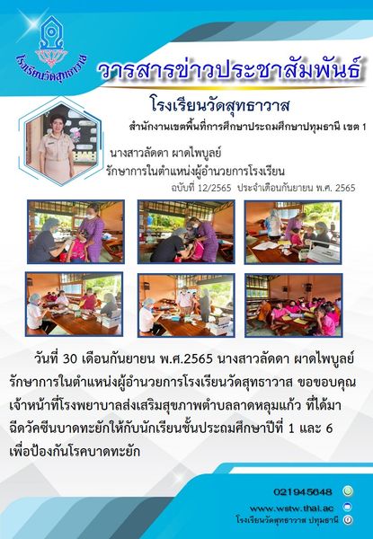 วันที่ 30 กันยายน พ.ศ.2565 นางสาวลัดดา ผาดไพบูลย์ รักษาการในตำแหน่งผู้อำนวยการโรงเรียนวัดสุทธาวาส ขอขอบคุณเจ้าหน้าที่โรงพยาบาลส่งเสริมสุขภาพตำบลลาดหลุมแก้ว ที่ได้มาฉีดวัคซีนบาดทะยักให้กับนักเรียนชั้นประถมศึกษาปีที่ 1 และ 6 เพื่อป้องกันโรคบาดทะยัก