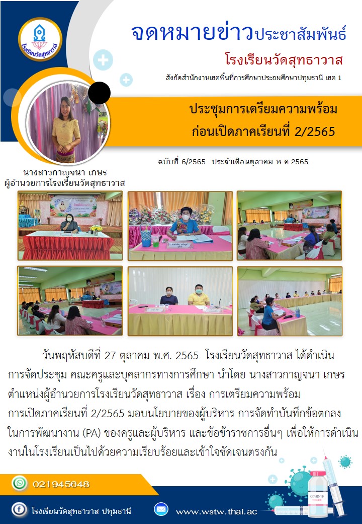 โรงเรียนวัดสุทธาวาส เรื่อง การเตรียมความพร้อม การเปิดภาคเรียนที่ 2/2565 มอบนโยบายของผู้บริหาร การจัดทำบันทึกข้อตกลงในการพัฒนางาน (PA) ของครูและ