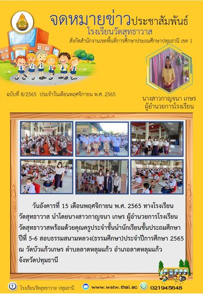 วันอังคารที่ 15 พฤศจิกายน พ.ศ. 2565 ทางโรงเรียนวัดสุทธาวาส นำโดยนางสาวกาญจนา เกษร ผู้อำนวยการโรงเรียนวัดสุทธาวาส พร้อมด้วยคุณครูประจำชั้นนำนักเรียนชั้นประถมศึกษาปีที่ 5 - 6 สอบธรรมสนามหลวง (ธรรมศึกษา) ประจำปีการศึกษา 2565 ณ วัดบัวแก้วเกษรตำบลลาดหลุมแก้ว อำเภอลาดหลุมแก้ว จังหวัดปทุมธานี