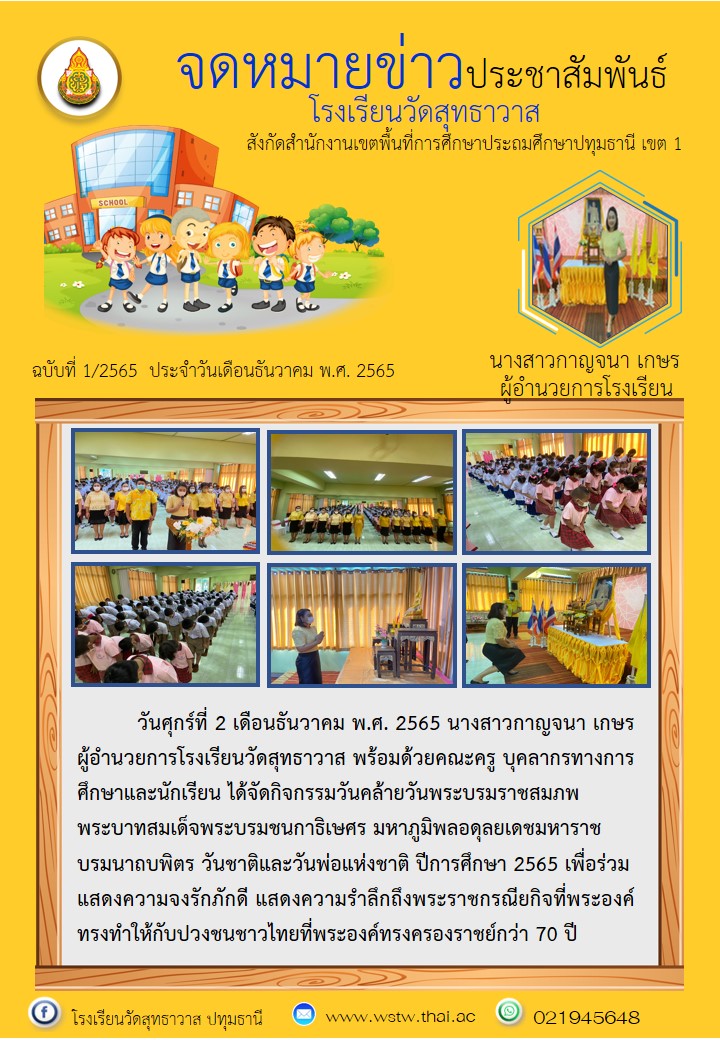 วันศุกร์ที่ 2 ธันวาคม พ.ศ. 2565 นางสาวกาญจนา เกษร ผู้อำนวยการโรงเรียนวัดสุทธาวาส พร้อมด้วยคณะครู บุคลากรทางการศึกษาและนักเรียน ได้จัดกิจกรรมวันคล้ายวันพระบรมราชสมภพพระบาทสมเด็จพระบรมชนกาธิเษศร มหาภูมิพลอดุลยเดชมหาราช บรมนาถบพิตร วันชาติและวันพ่อแห่งชาติ ปีการศึกษา 2565 เพื่อร่วมแสดงความจงรักภักดี แสดงความรำลึกถึงพระราชกรณียกิจที่พระองค์ทรงทำให้กับปวงชนชาวไทยที่พระองค์ทรงครองราชย์กว่า 70 ปี