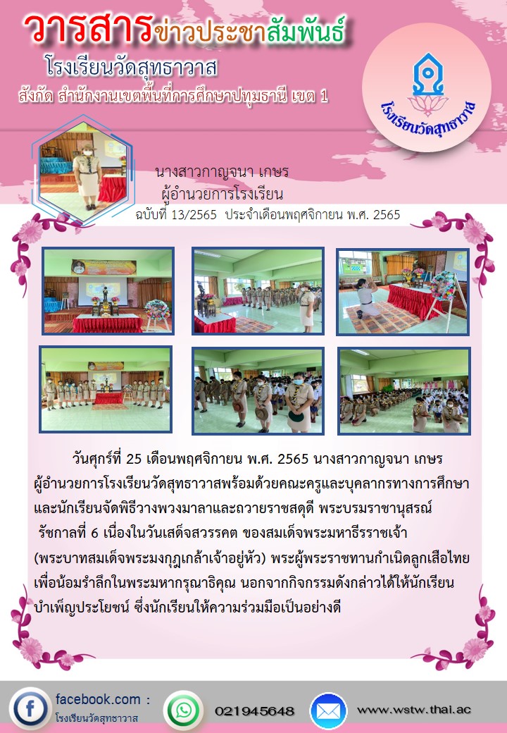 วันศุกร์ที่ 25 พฤศจิกายน พ.ศ. 2565 นางสาวกาญจนา เกษร ผู้อำนวยการโรงเรียนวัดสุทธาวาส พร้อมด้วยคณะครูและบุคลากรทางการศึกษาและนักเรียน