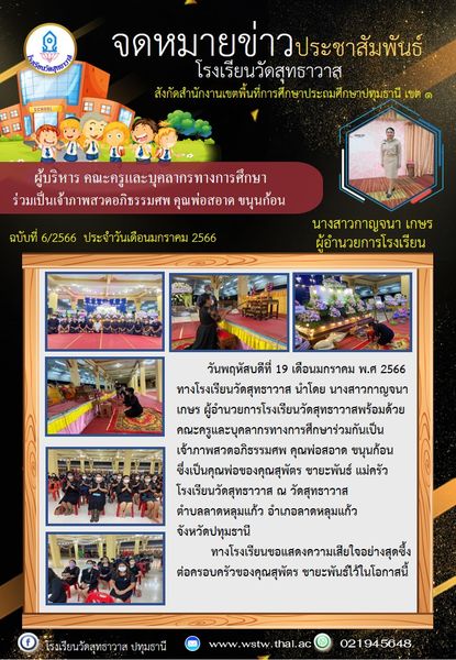 วันพฤหัสบดีที่ 19 มกราคม พ.ศ 2566 ทางโรงเรียนวัดสุทธาวาส นำโดย นางสาวกาญจนา เกษร ผู้อำนวยการโรงเรียนวัดสุทธาวาสพร้อมด้วยคณะครูและบุคลากรทางการศึกษาร่วมกันเป็นเจ้าภาพสวดอภิธรรมศพ คุณพ่อสอาด ขนุนก้อนซึ่งเป็นคุณพ่อของคุณสุพัตร ชายะพันธ์ แม่ครัวโรงเรียนวัดสุทธาวาส ณ วัดสุทธาวาส ตำบลลาดหลุมแก้ว อำเภอลาดหลุมแก้ว จังหวัดปทุมธานี ทางโรงเรียนขอแสดงความเสียใจอย่างสุดซึ้งต่อครอบครัว ของคุณสุพัตร ชายะพันธ์ไว้ในโอกาสนี้