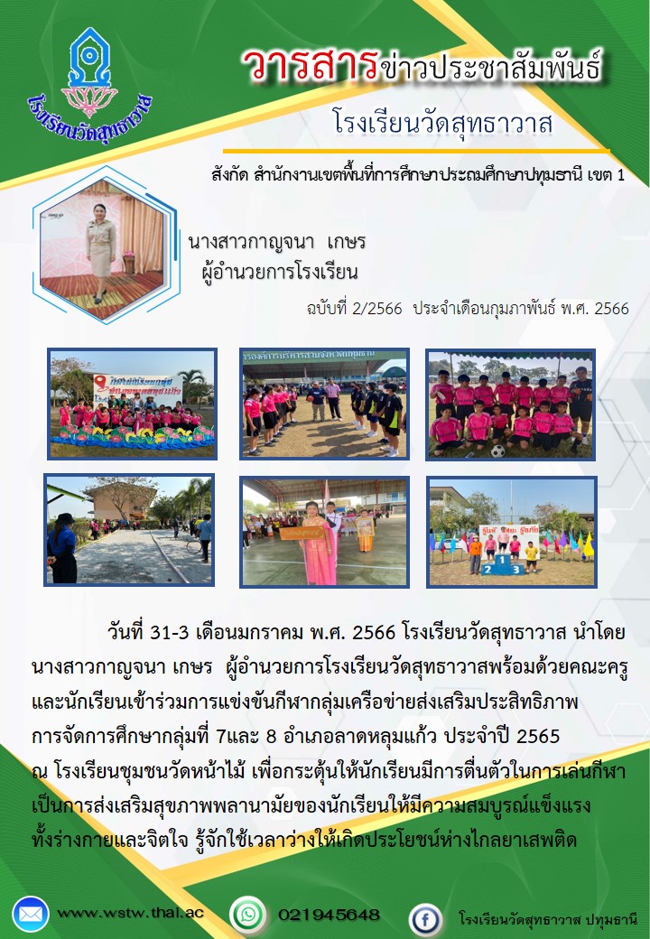 พร้อมด้วยคณะครูและนักเรียนเข้าร่วมการแข่งขันกีฬากลุ่มเครือข่ายส่งเสริมประสิทธิภาพการจัดการศึกษากลุ่มที่ 7 และ 8 อำเภอลาดหลุมแก้ว ประจำปี 2565 ณ โรงเรียนชุมชนวัดหน้าไม้ เพื่อกระตุ้นให้นักเรียน มีการตื่นตัวในการเล่นกีฬาเป็นการส่งเสริมสุขภาพพลานามัยของนักเรียนให้มีความสมบูรณ์แข็งแรง ทั้งร่างกายและจิตใจ รู้จักใช้เวลาว่าง ให้เกิดประโยชน์ห่างไกลยาเสพติด