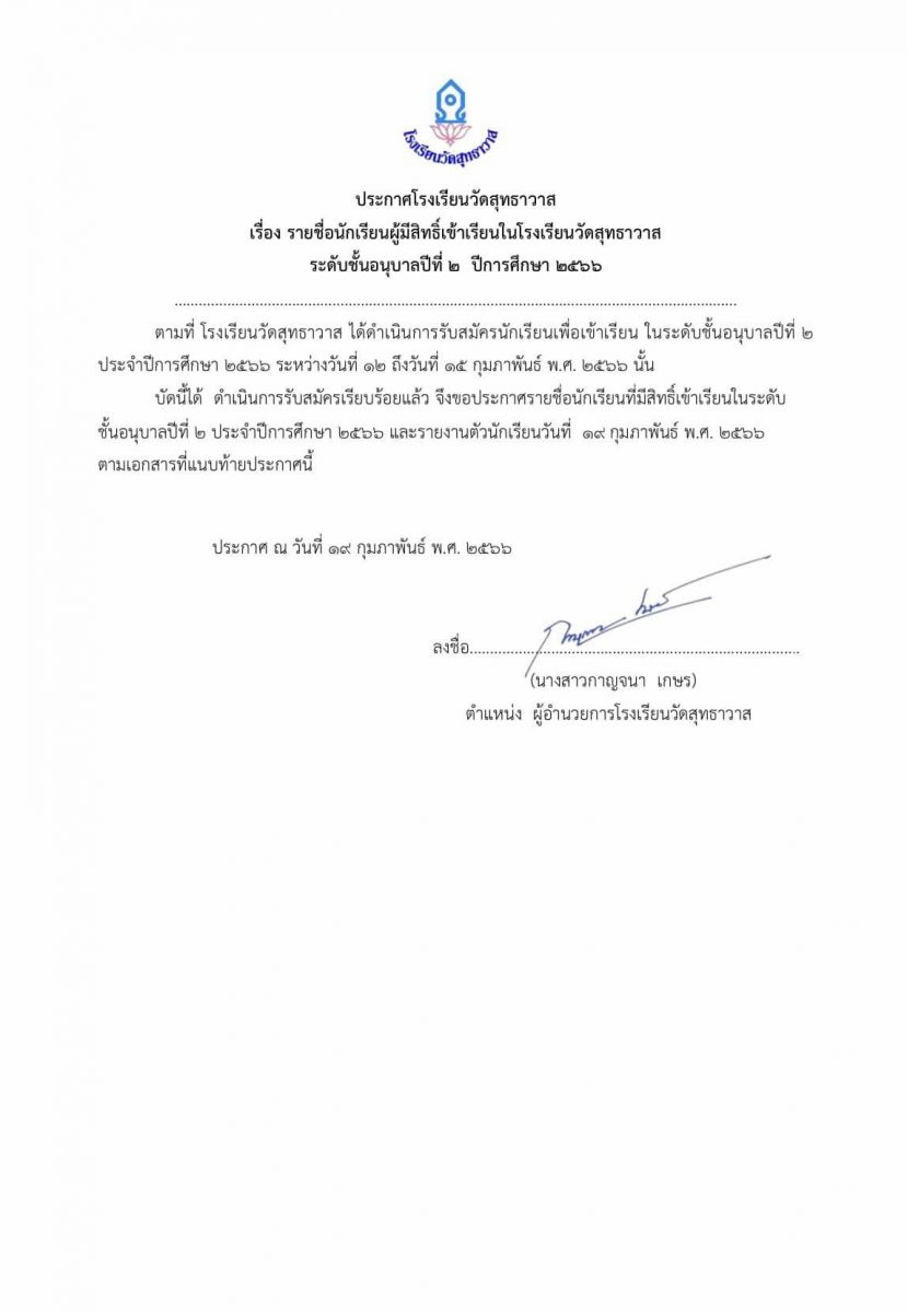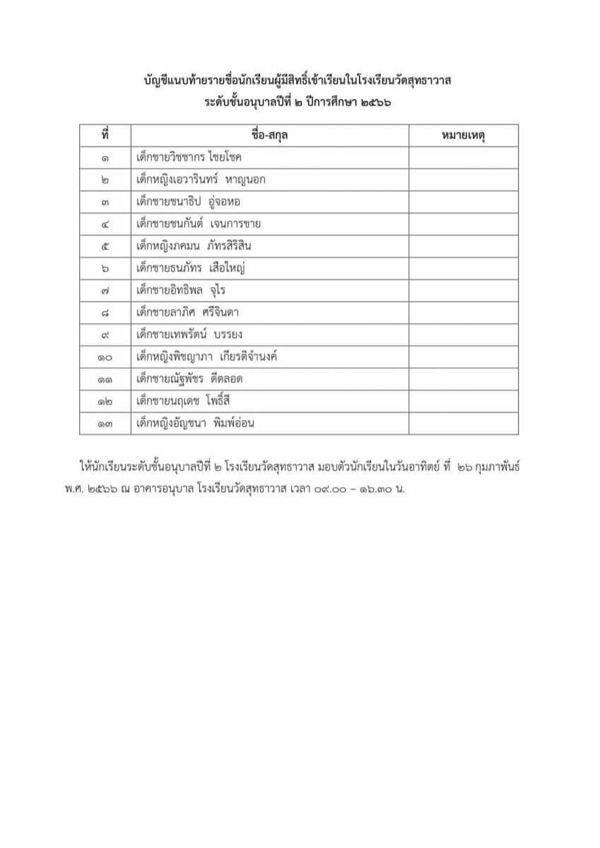 ประกาศรายชื่่่อผู้มีสิทธิ์เขาเรียนโรงเรียนวัดสุทธาวาส ระดับชั้นอนุบาลปีที่ 2