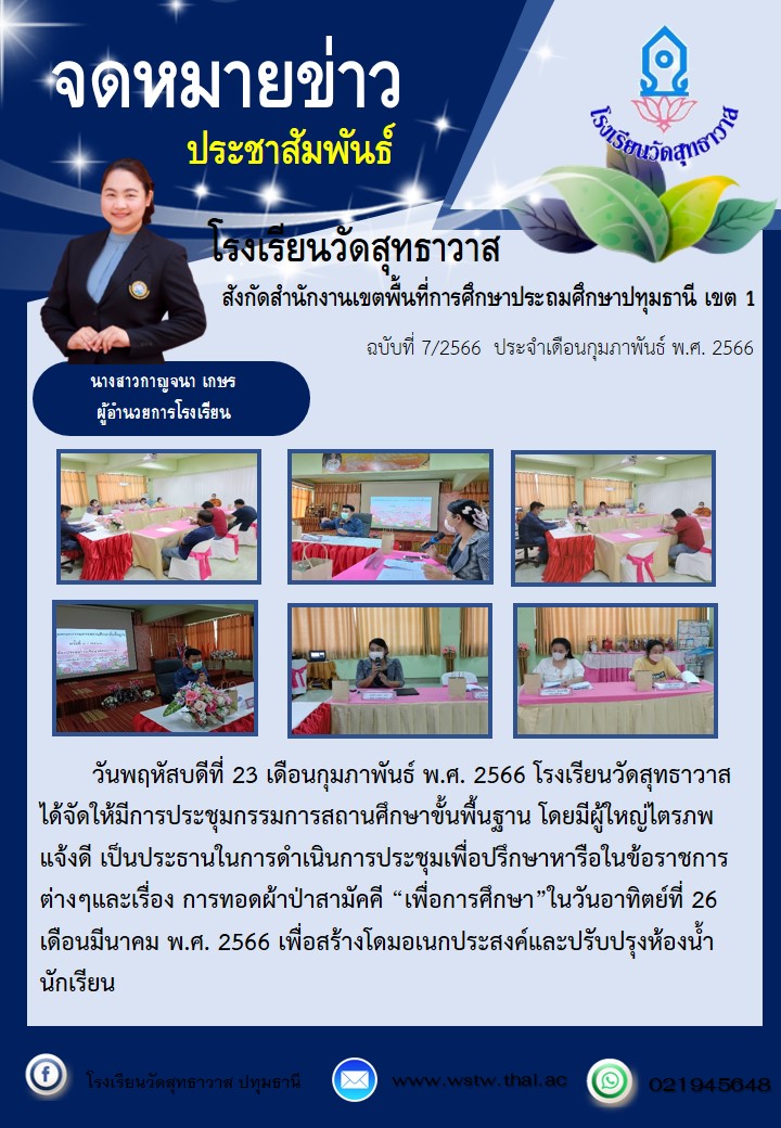 วันพฤหัสบดีที่ 23 กุมภาพันธ์ พ.ศ. 2566 โรงเรียนวัดสุทธาวาสได้จัดให้มีการประชุมกรรมการสถานศึกษาขั้นพื้นฐาน โดยมีผู้ใหญ่ไตรภพ แจ้งดี เป็นประธานในการดำเนินการประชุมเพื่อปรึกษาหารือในข้อราชการต่างๆและเรื่อง การทอดผ้าป่าสามัคคี