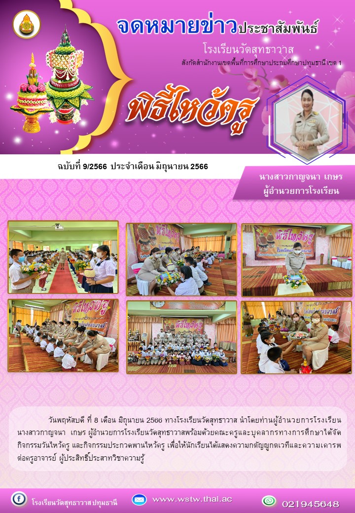วันพฤหัสบดี ที่ 8  มิถุนายน 2566 ทางโรงเรียนวัดสุทธาวาส นำโดยท่านผู้อำนวยการโรงเรียน นางสาวกาญจนา เกษร ผู้อำนวยการโรงเรียนวัดสุทธาวาสพร้อมด้วยคณะครูและบุคลากรทางการศึกษาได้จัดกิจกรรมวันไหว้ครู และกิจกรรมประกวดพานไหว้ครู เพื่อให้นักเรียนได้แสดงความกตัญญูกตเวทีและความเคารพต่อครูอาจารย์ ผู้ประสิทธิ์ประสาทวิชาความรู้