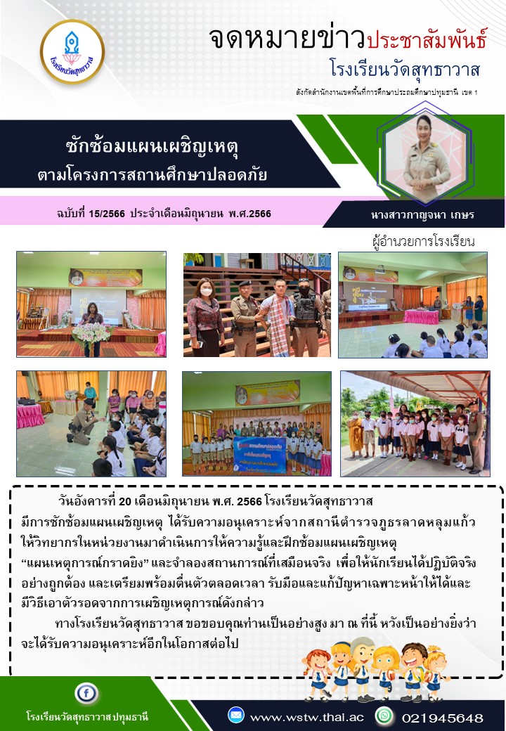วันอังคารที่ 20 เดือนมิถุนายน พ.ศ. 2566 โรงเรียนวัดสุทธาวาส มีการซักซ้อมแผนเผชิญเหตุ ได้รับความอนุเคราะห์จากสถานีตำรวจภูธรลาดหลุมแก้วให้วิทยากรในหน่วยงานมาดำเนินการให้ความรู้และฝึกซ้อมแผนเผชิญเหตุ “แผนเหตุการณ์กราดยิง” และจำลองสถานการณ์ที่เสมือนจริง เพื่อให้นักเรียนได้ปฏิบัติจริงอย่างถูกต้อง และเตรียมพร้อมตื่นตัวตลอดเวลา รับมือและแก้ปัญหาเฉพาะหน้าให้ได้และมีวิธีเอาตัวรอดจากการเผชิญเหตุการณ์ดังกล่าว ทางโรงเรียนวัดสุทธาวาส ขอขอบคุณท่านเป็นอย่างสูง มา ณ ที่นี้ หวังเป็นอย่างยิ่งว่าจะได้รับความอนุเคราะห์อีกในโอกาสต่อไป