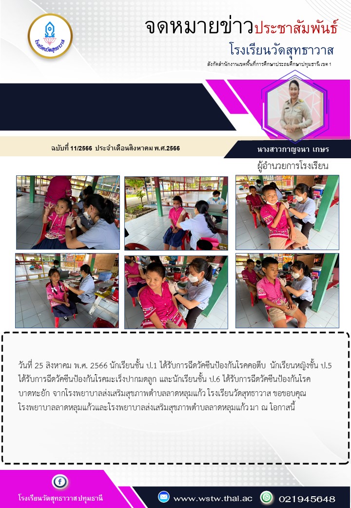วันที่ 25 สิงหาคม พ.ศ. 2566 นักเรียนชั้น ป.1 ได้รับการฉีดวัคซีนป้องกันโรคคอตีบ นักเรียนหญิงชั้น ป.5 ได้รับการฉีดวัคซีนป้องกันโรคมะเร็งปากมดลูก และนักเรียนชั้น ป.6 ได้รับการฉีดวัคซีนป้องกันโรคบาดทะยัก จากโรงพยาบาลส่งเสริมสุขภาพตำบลลาดหลุมแก้ว โรงเรียนวัดสุทธาวาส ขอขอบคุณ โรงพยาบาลลาดหลุมแก้วและโรงพยาบาลส่งเสริมสุขภาพตำบลลาดหลุมแก้ว มา ณ โอกาสนี้