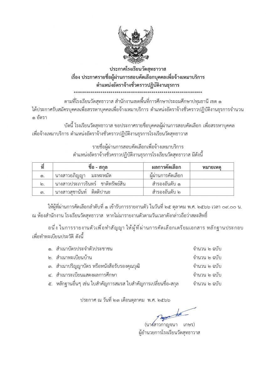 ตำแหน่งอัตราจ้างชั่วคราวปฏิบัติงานธุรการโรงเรียนวัดสุทธาวาส