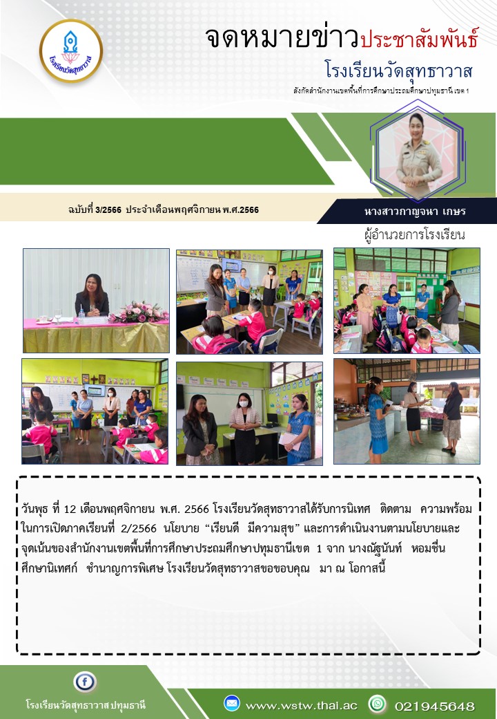 วันพุธ ที่ 12 เดือนพฤศจิกายน พ.ศ. 2566 โรงเรียนวัดสุทธาวาสได้รับการนิเทศ  ติดตาม  ความพร้อมในการเปิดภาคเรียนที่ 2/2566  นโยบาย “เรียนดี  มีความสุข” และการดำเนินงานตามนโยบายและจุดเน้นของสำนักงานเขตพื้นที่การศึกษาประถมศึกษาปทุมธานีเขต 1 จาก นางณัฐนันท์  หอมชื่น  ศึกษานิเทศก์  ชำนาญการพิเศษ โรงเรียนวัดสุทธาวาสขอขอบคุณ  มา ณ โอกาสนี้