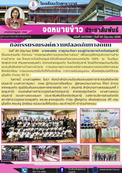 กิจกรรมรณรงค์ความปลอดภัยทางถนน วันที่ 20 มิถุนายน 2568 นายพงศธร กาญจนะจิตรา รองผู้ว่าราชการจังหวัดปทุมธานีเป็นประธานเปิด กิจกรรม “การรณรงค์ความปลอดภัยทางถนน” เพื่อลดอุบัติเหตุบริเวณทางข้าม ทางม้าลาย และ โครงการจังหวัดปทุมธานีขับขี่ปลอดภัยสวมหมวกนิรภัย 100% ณ โรงเรียนวัดสุทธาวาส ตำบลลาดหลุมแก้ว อำเภอลาดหลุมแก้ว จังหวัดปทุมธานี โดยมีกิจกรรมร่วมกันเดินรณรงค์บริเวณทางข้ามทางม้าลาย การบรรยายความปลอดภัยทางถนนความปลอดภัยทางถนนให้แก่นักเรียน การมอบหมวกนิรภัยให้กับนักเรียน จากการสนับสนุนของ สโมสรฟุตบอลบีจีปทุม ยูไนเต็ด จำนวน 30 ใบ ในการนี้ นางสาวสุพีพร โมรา หัวหน้าสำนักงานป้องกันและบรรเทาสาธารณภัยจังหวัดปทุมธานี นางสาวกาญจนา เกษร ผู้อำนวยการโรงเรียน ผู้แทนหน่วยงานต่างๆ ได้แก่ อำเภอลาดหลุมแก้ว ศูนย์ป้องกันและบรรเทาสาธารณภัย เขต 1 ปทุมธานี สำนักงานทางหลวงชนบทที่ 1 (ปทุมธานี) กองบังคับการตำรวจภูธรจังหวัดปทุมธานี สาธารณสุขจังหวัด แขวงทางหลวงปทุมธานี แขวงทางหลวงชนบท ประชาสัมพันธ์จังหวัดปทุมธานี องค์การบริหารส่วนจังหวัด สถานีตำรวจภูธรลาดหลุมแก้ว รพ.สต.ลาดหลุมแก้ว กำนัน ผู้ใหญ่บ้าน สโมสรฟุตบอล บีจี ปทุม ยูไนเต็ด คณะครู นักเรียน หน่วยงานที่เกี่ยวข้อง และเจ้าหน้าที่ เข้าร่วมกิจกรรม