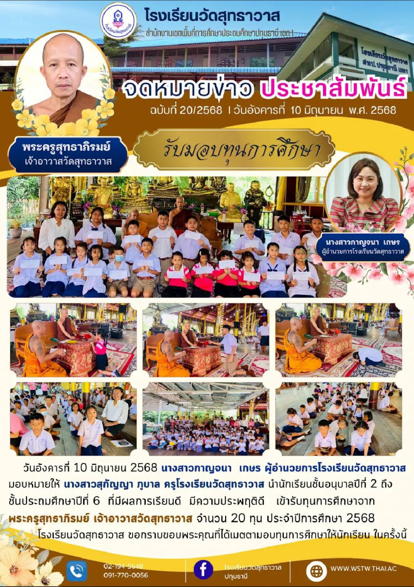 วันอังคารที่ 10 มิถุนายน 2568 นางสาวกาญจนา เกษร ผู้อำนวยการโรงเรียนวัดสุทธาวาส มอบหมายให้ นางสาวสุกัญญา ภูบาล ครูโรงเรียนวัดสุทธาวาส นำนักเรียนชั้นอนุบาลปีที่ 2 ถึงชั้นประถมศึกษาปีที่ 6 ที่มีผลการเรียนดี มีความประพฤติดี เข้ารับทุนการศึกษาจากพระครูสุทธาภิรมย์ เจ้าอาวาสวัดสุทธาวาส จำนวน 20 ทุน ประจำปีการศึกษา 2568 โรงเรียนวัดสุทธาวาส ขอกราบขอบพระคุณที่ได้เมตตามอบทุนการศึกษาให้นักเรียน ในครั้งนี้
