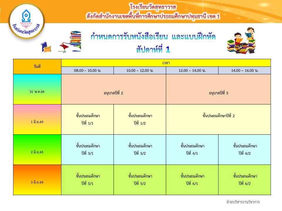 กำหนดการรับหนังสือเรียนและแบบฝึกหัดในสัปดาห์ที่ 1 ทั้งนี้ผู้ปกครองท่านใดที่จะซื้อชุดนักเรียน หรืออุปกรณ์การเรียนสามารถซื้อได้ที่สหกรณ์ของโรงเรียนได้เลยตั้งแต่วันที่ 31 พฤษภาคม - 3 มิถุนายน 2564
