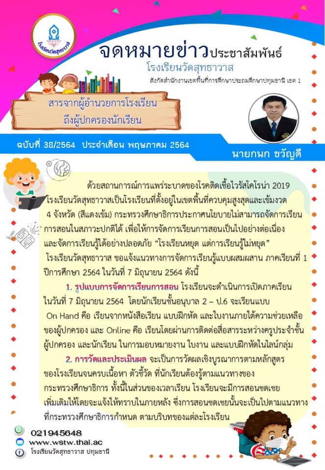 สารจากผู้อำนวยการโรงเรียนวัดสุทธาวาสถึงผู้ปกครองเรื่องของรูปแบบการจัดการเรียนการสอนและการวัดและประเมินผล