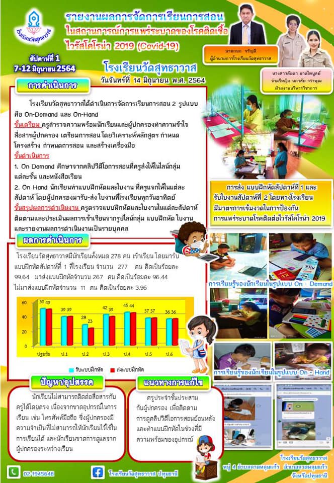 รายงานผลการจัดการเรียนการสอนของโรงเรียนวัดสุทธาวาสในสถานการณ์การแพร่ระบาดของโรคติดเชื้อไวรัสโคโรนา 2019 (COVID-19) สัปดาห์ที่ 1