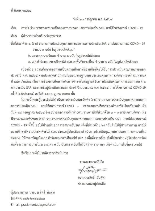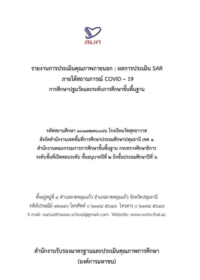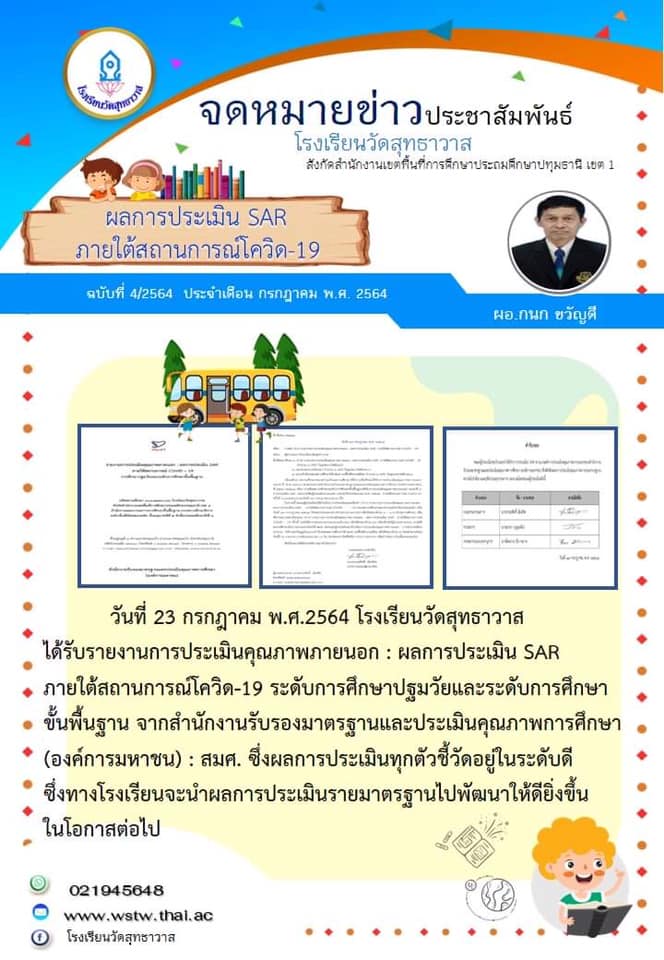วันศุกร์ที่ 23 กรกฎาคม พ.ศ.2564 โรงเรียนวัดสุทธาวาสได้รับรายงานการประเมินคุณภาพภายนอก : ผลการประเมิน SAR ภายใต้สถานการณ์โควิด-19 ระดับการศึกษาปฐมวัยและระดับการศึกษาขั้นพื้นฐานจากสำนักงานรับรองมาตรฐานและประเมินคุณภาพการศึกษา (องค์การมหาชน) : สมศ. ซึ่งผลการประเมินทุกตัวชี้วัดอยู่ในระดับดี ซึ่งทางโรงเรียนจะนำผลการประเมินรายมาตรฐานไปพัฒนาให้ดียิ่งขึ้นในโอกาสต่อไป